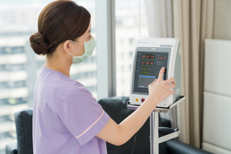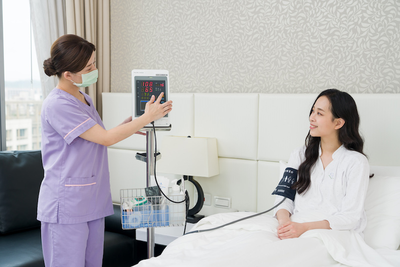 護理長透過精密儀器血氧血壓計定期檢評估身體狀況,給予產後健康建議與關懷,更有專業衛教與塑腹帶指導服務,讓照護全方位照護媽咪的恢復。